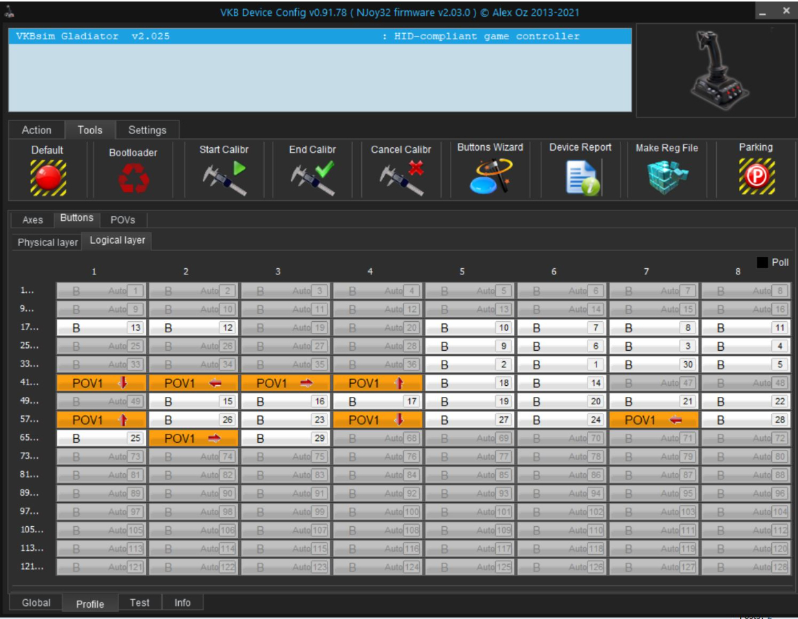 Post 2 screenshots: Profile/Buttons/Physical and Logical. Don't cut off the header, post the whole window.