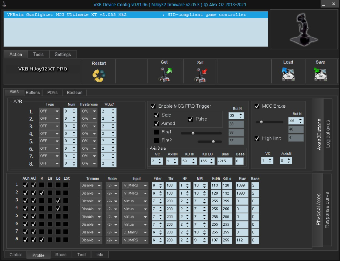 Attached is a screenshot from the VKB Configuration program that shows the Axes profile page from a profile that I use for DCS. You will see at the top that I have the MCG Ultimate grip running v2.025 firmware. I've only had the grip and base for about two weeks. I have enabled the MCG Pro Trigger "Safe" and "Armed" virtual buttons. The problem is that the stick forgets these settings sometimes when the computer is powered down. That is, after booting my computer from a powered off state, switching the trigger from safe to armed or armed to safe no longer generates virtual button presses, as verified on the "test" tab or using VKB_BtnTester.exe. These are the only settings that are not retained as nearly as I can tell. This is happening maybe 50-75% of the time I start the computer. When it happens I can restore functionality by reloading the profile from a saved file and then using the "set" function to save it to the device. It then works fine until the next time I start the computer after powering down. Please advise how to fix this problem.