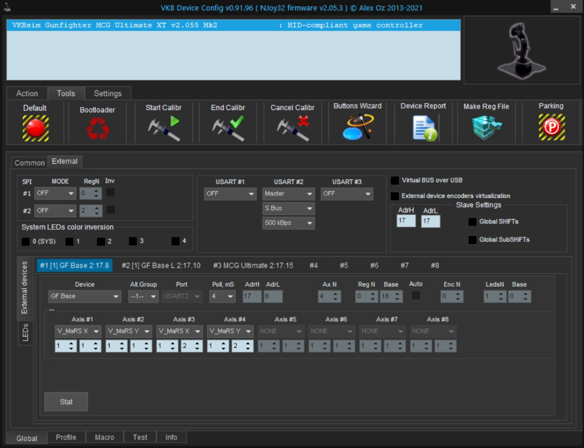 The Global/External/External Devices page has three external device tabs populated so I'm attaching three screenshots, one for each. These were taken right after pushing the default button and then recalibrating. BTW, the trigger axis does not show up on the axis test page. Is that normal?