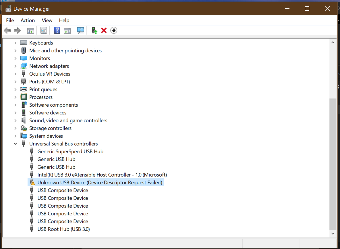 My Gladiator Mk.I is no longer being detected by Windows 10. It is showing up in Device Manager as Unknown USB Device (Device Descriptor Request Failed) and is not being detected by any of the VKB software. I have tried the joystick on multiple computers and in different USB ports, none of them are registering the device. In addition, the lights on the joystick base no longer light up. I have attempted the “non-software” calibration and the hard reset on the stick and nothing has made any effect.