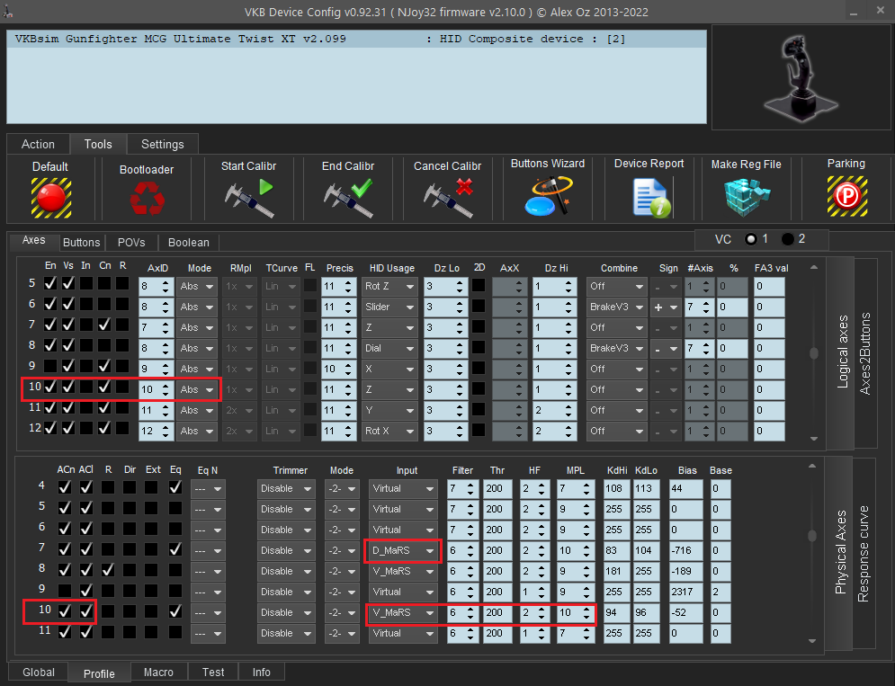 Open VKBDevCfg, change the settings outlined in red boxes, hit set, and recalibrate.