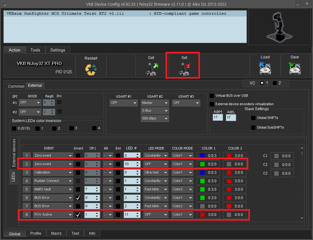 Change LEDs 10 and 11 to Off, then press Set to save. You might still have them flashing, as the device responds with white color to events that cannot be controlled at user level, but let us know.