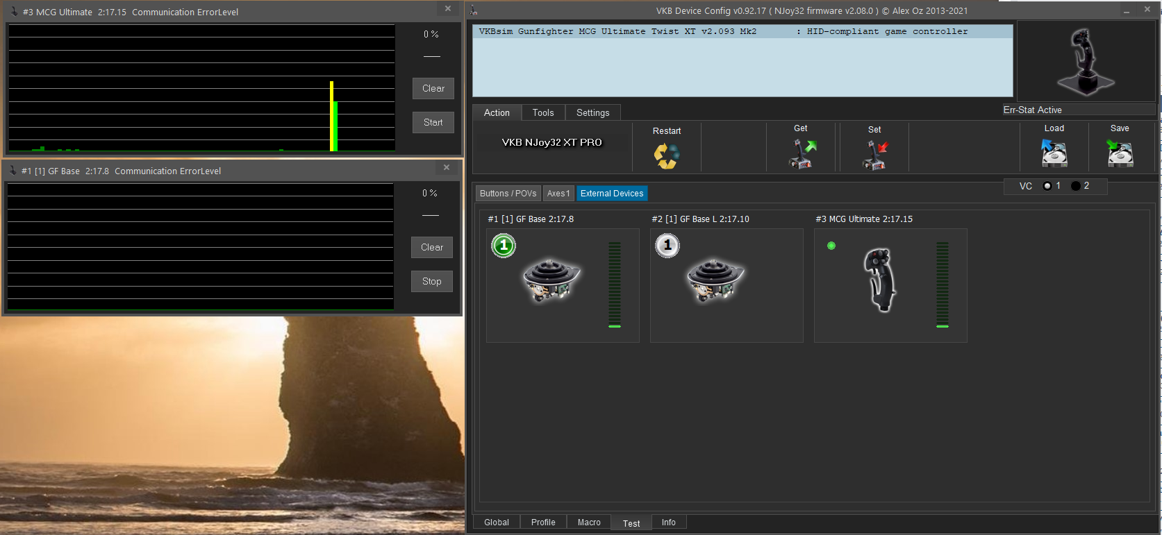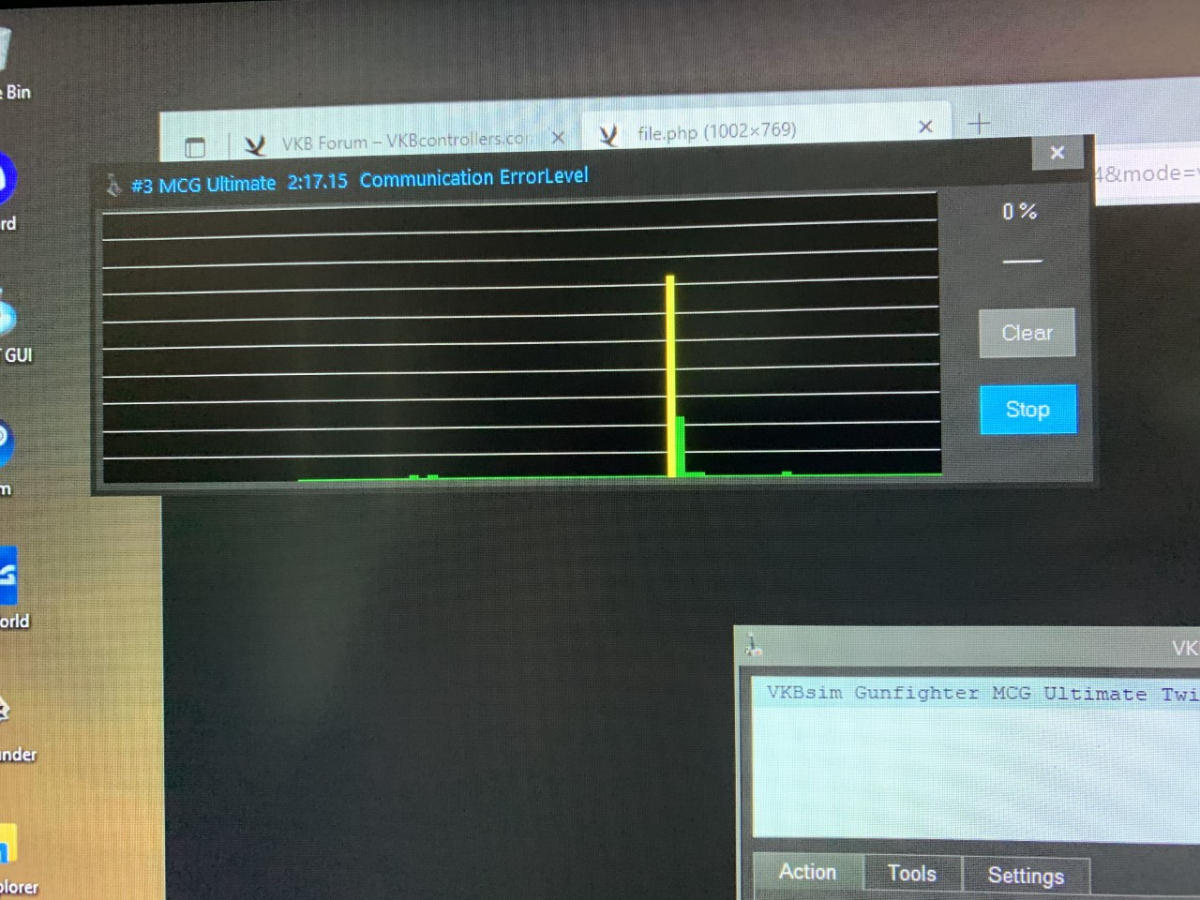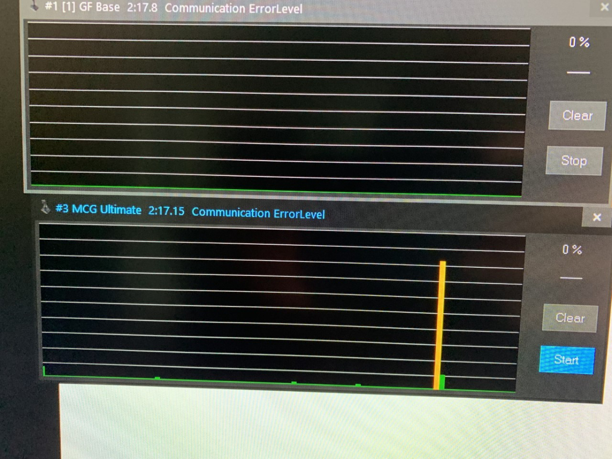 It seems I spoke too soon, the white lights are still flashing intermittently. Its back to electrical tape I guess. I did notice bigger spikes on the error communications tab for the grip, no errors for the base. Over a duration of about 30 minutes I had three spikes, 2 yellow and 1 orange for the grip. I dont have any errors when the stick is not moving. I tried taking off the base plate and jiggling the wires and plugs from the board going to the x and y axis and had no errors. here is screenshots of the spikes: