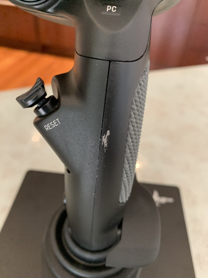 I noticed the paint is peeling off my MCG Ultimate grip. Its starting to flake off where my palm rests on the front. The seam is starting to lose more and more paint. I've only had this grip a few months and I only use water and a paper towel to wipe it down once in a while. I have taken pictures of the paint peeling. I live in a home with air conditioning and the room my flight stick is in is climate controlled. I've enclosed a couple of pictures of where the paint is peeling off. I notice its started running down the seam.