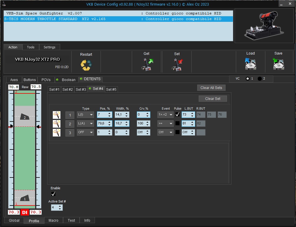 Troubles come when I try to set up the afterburner detent. I want the throttles in game to reach full MIL when the physical throttles (let's call them the grips) get to the detent, so I set up the second CRV to 100. Once past the detent, the direct input should always be at 100, but it's not. In fact, if I move the grips to the detent slowly, they get to 100 when they hit the detent, but immediately after, as the grips moves on the detent, DI drops at 70,3/70,4 and stay there till the grips get past the detent. I'm attaching some pictures, I hope they'll help understand.