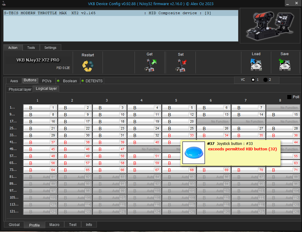 Then I checked the logical layer in vkbdevcfg and noticed that any button above 32 shows up with errors:
