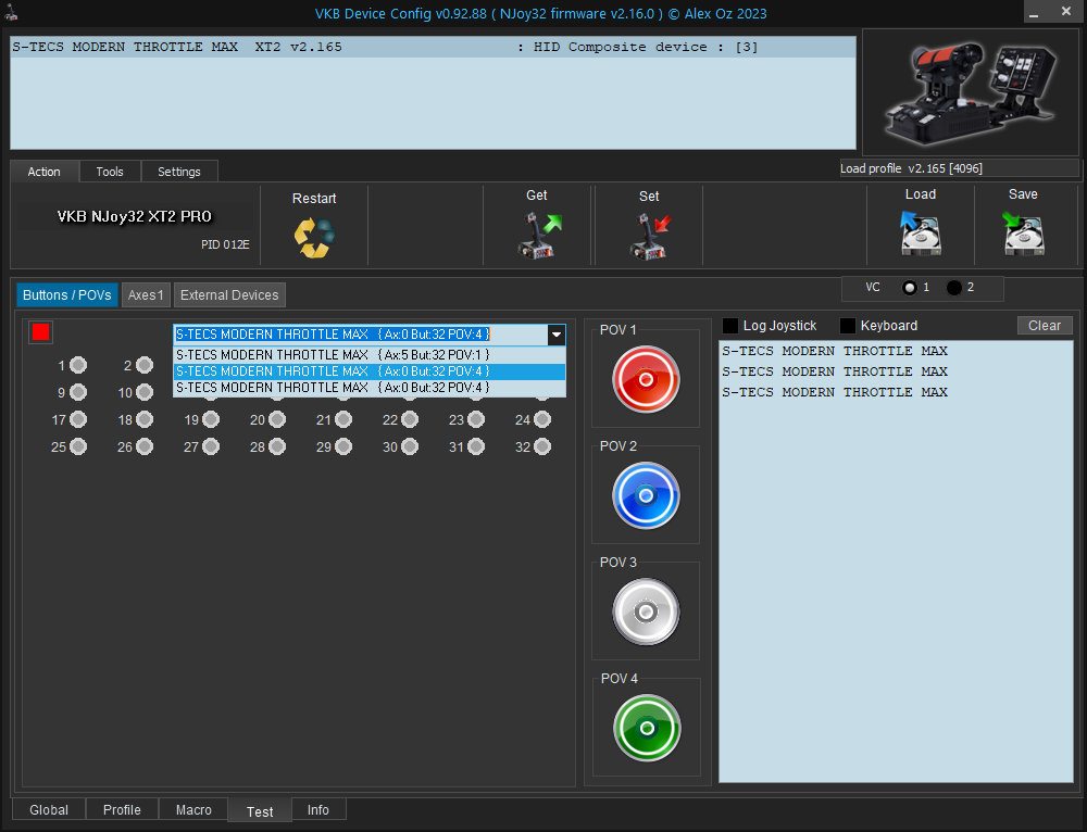 The result looked promising, since I did see a 32 button split for 3 devices at the Buttons/POVS screen and I could see button presses light up on the different virtual devices: