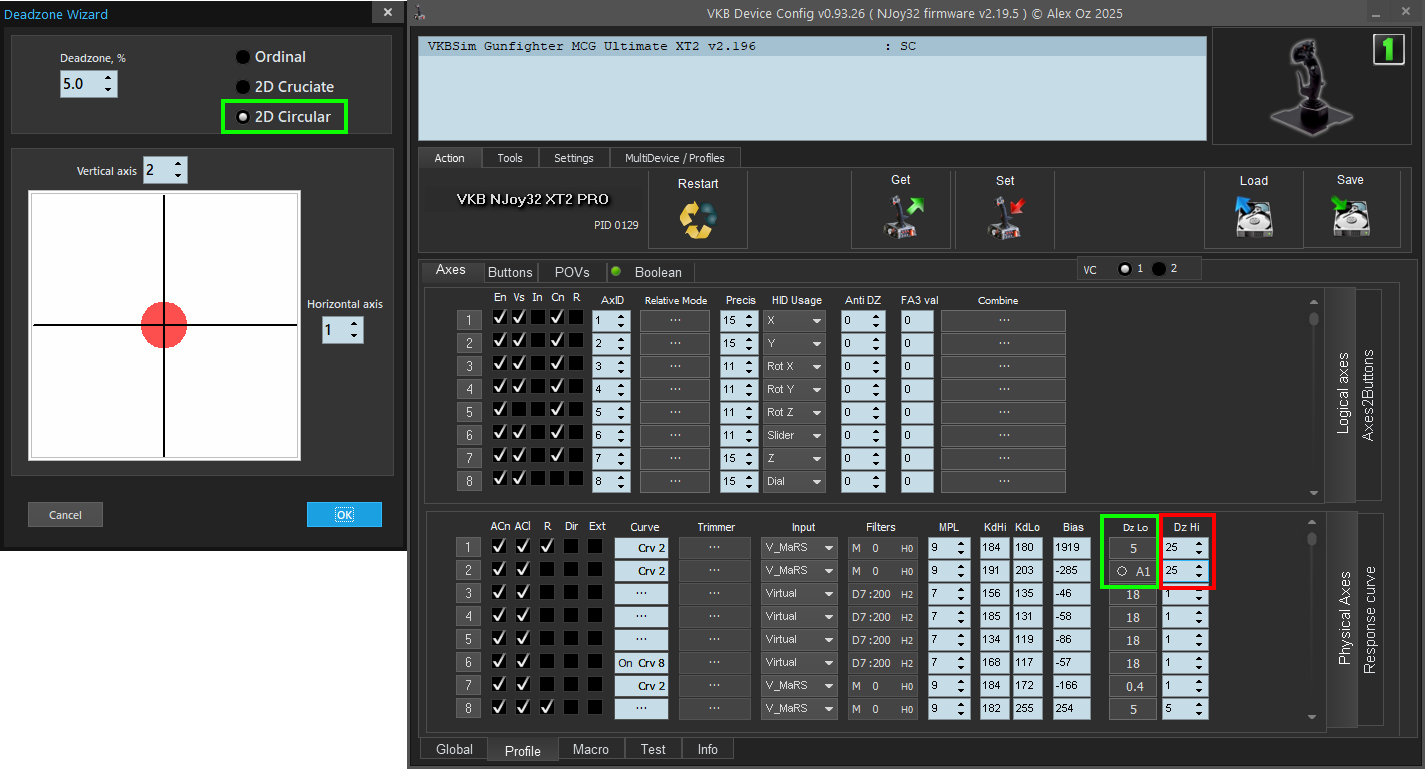 The user utilizes 2D Circular DzLo, for avoiding a Dz lock crossing center for Rotational axes in Star Citizen X=Yaw, Y=Pitch.