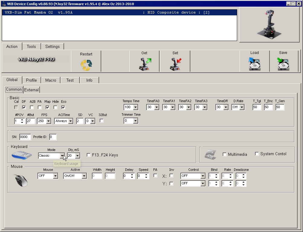 Open Global -Common tab. Check Map, Select Classic (Keyboard Mode). Press Set button. Check pinky button working as keyboard shift key.