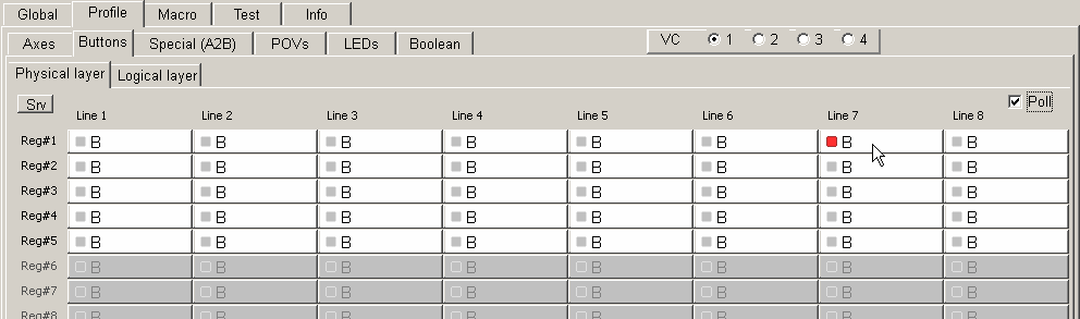 Look at upper picture. Check Poll. Now when you press joystick button its cell will be highlighted with red dot.