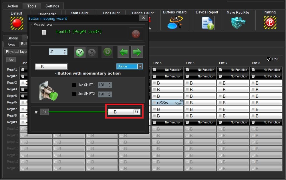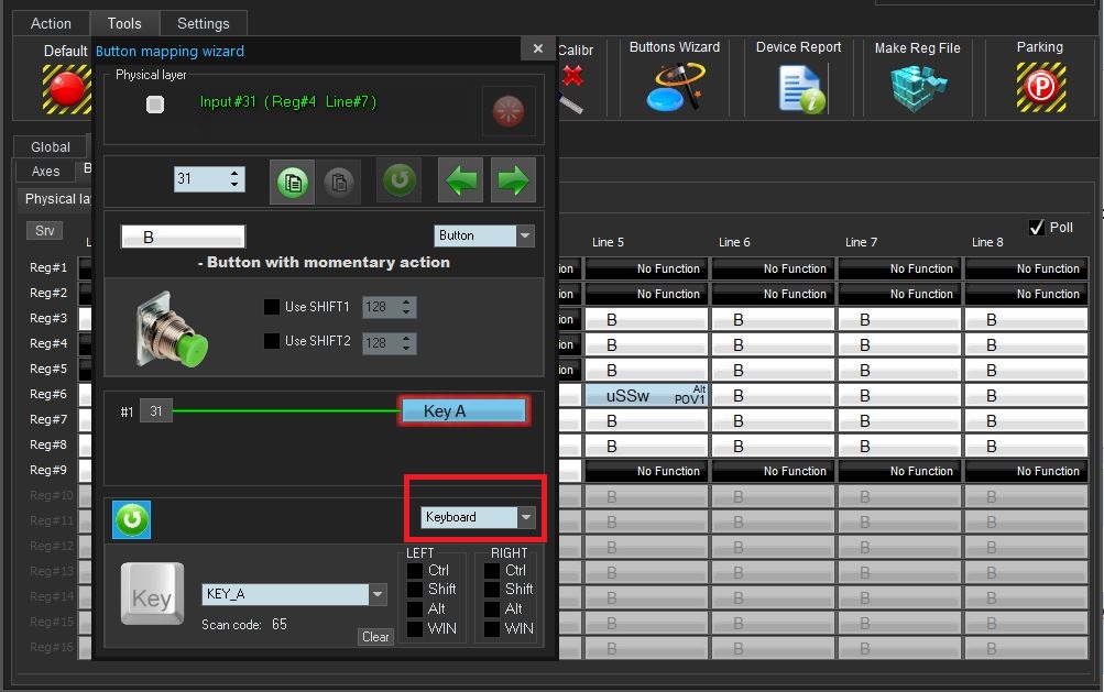 10.1. Identify in the Test/Buttons panel the buttons 33 and higher (for E:D), 51 and higher (for SC), or 65 and higher (for Il-2) and assign them to keyboard inputs;