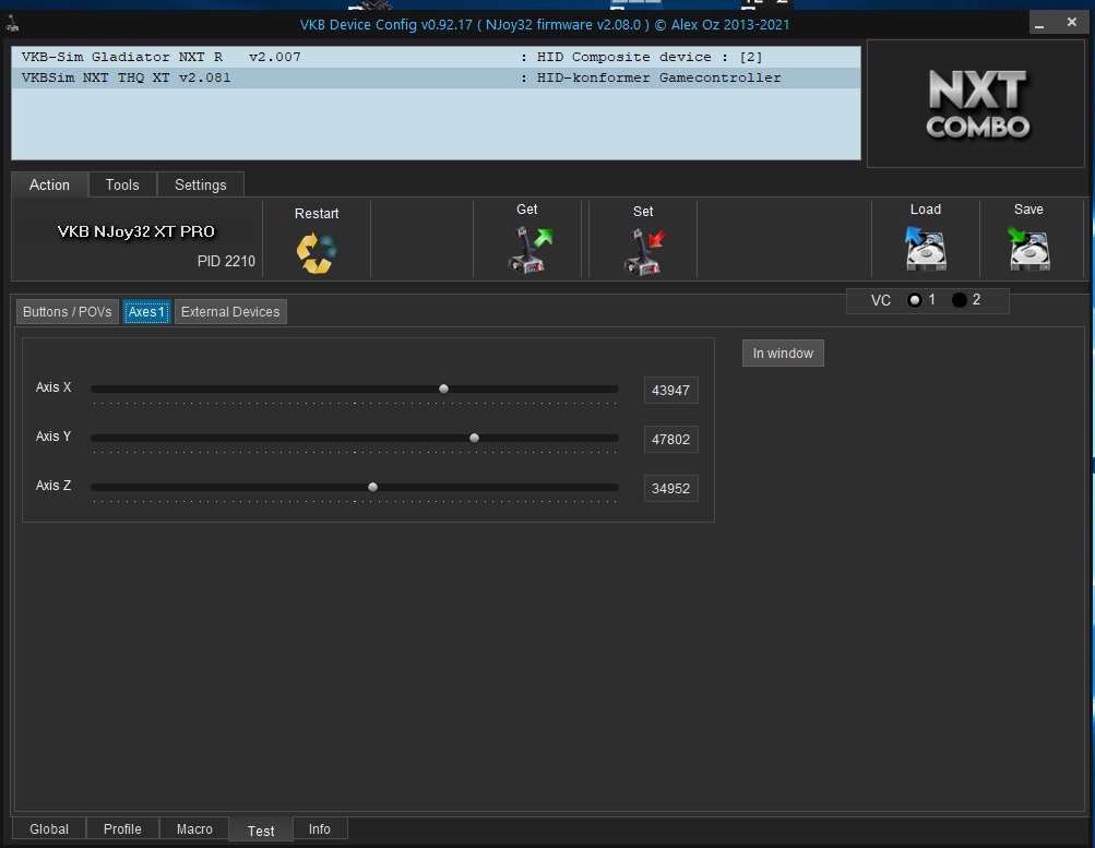 I had to invert the axis because FSX, P3D (both V4 and V5) and MSFS are reading them backwards, which give me control reversion issues with some aircraft that can't be corrected from within the sim. As you can see, all the parameters are the same for all 3 axis, except for High and Low gain coefficients. However, this is not enough for compensating the issue as I managed to do so in FSUIPC.
