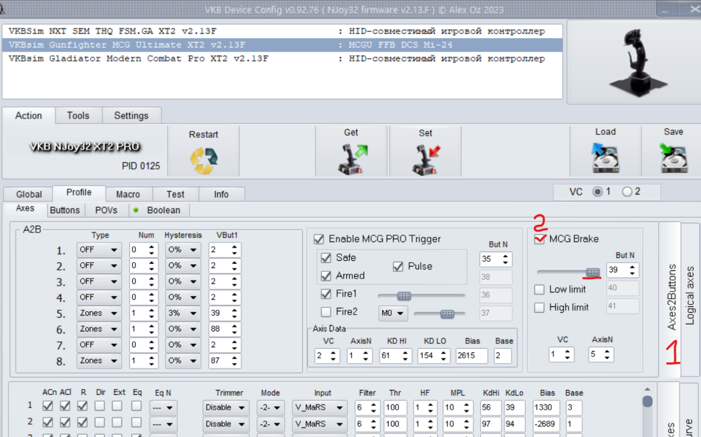!Note. I have not MCG handy so my example is based on other controller. Your axes and button numbers will differ.