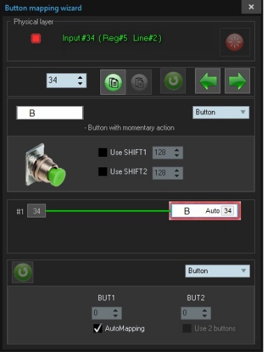 On the button mapping wizard screen, there is a red light on when the lever is not pressed in beside the "Input #34 (reg#5 Line#2) section at the top.