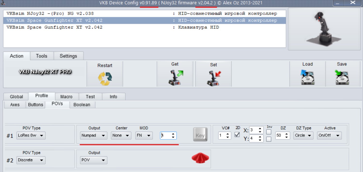 First you need to enable the keyboard in the Global tab and then configure the keys in the Povs tab. In this case, the switch of the stick axis / HAT is preserved.