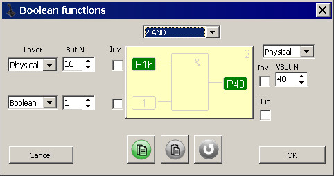 Click next slot and select 2AND function. Output will be registered if BOTH inputs are ON. 1st input layer = Physical button 15 - our modifier (Remember.....)). 2nd input is Boolean 1, Free output of comparator. Output = Physical button. Any free. 40 for me.