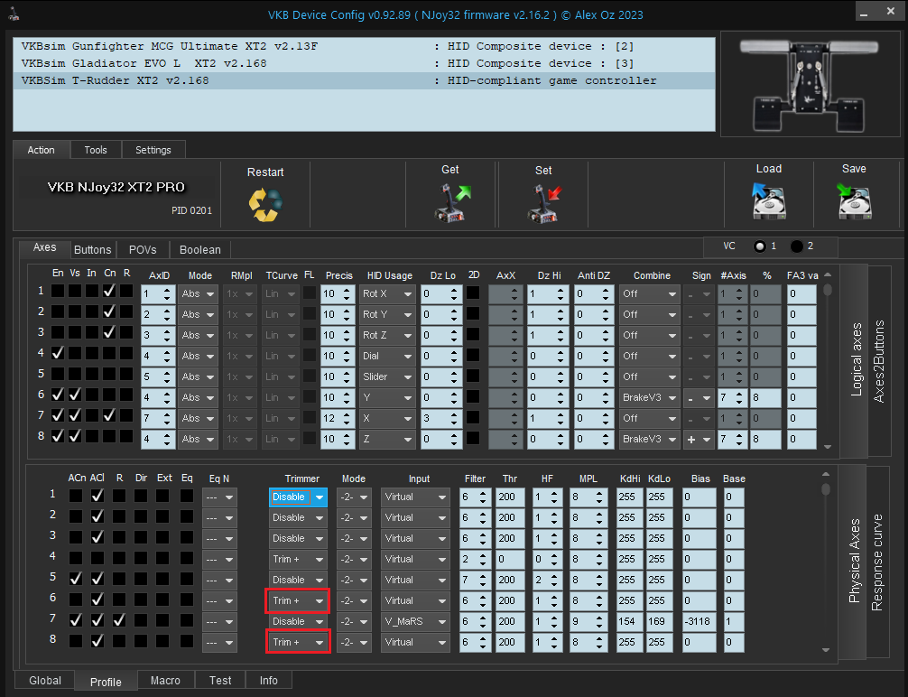 3. Make changes in Profile/Axes/Physical Axes panel for T-Rudders as indicated in the red boxes.