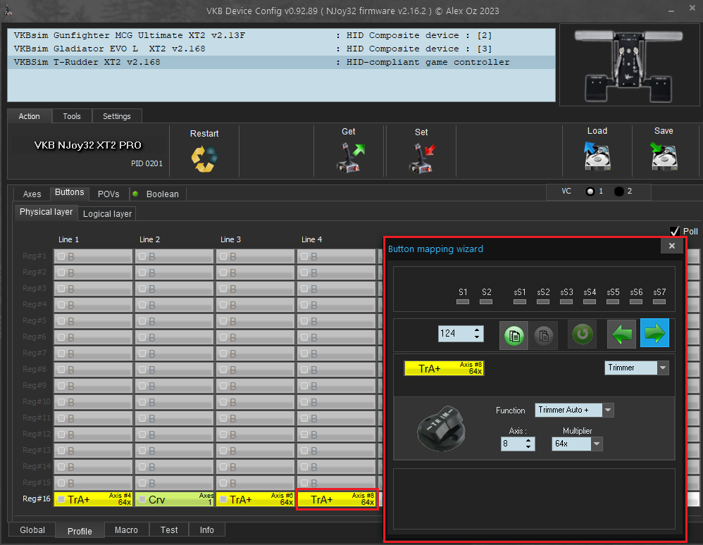 4. Make changes in Profile/Buttons/Physical layer panel for T-Rudders as indicated the red boxes.