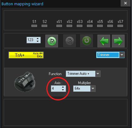 As per a discussion with Alex Oz, in Step 4A you enter the number of the rudder axis in the button profile. In this example, button 123 is setup as a trimmer and in the Axis field you enter 4 which is the rudder axis: