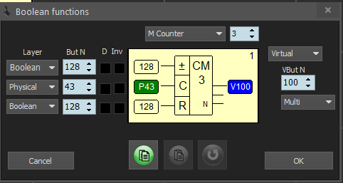 Step 1: Button 43 toggles through Virtual Buttons 100-102 with this Boolean function: