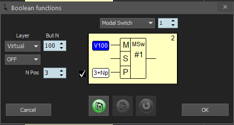 Step 2: The virtual Buttons 100-102 are now linked to a Modal Switch with three positions: