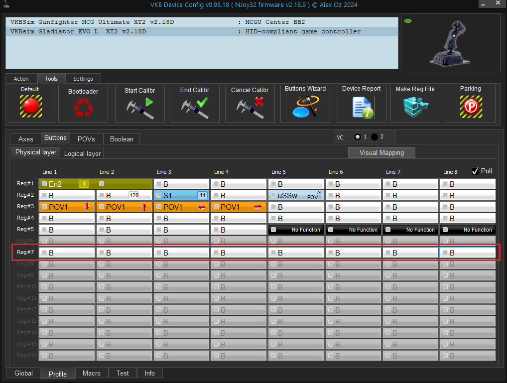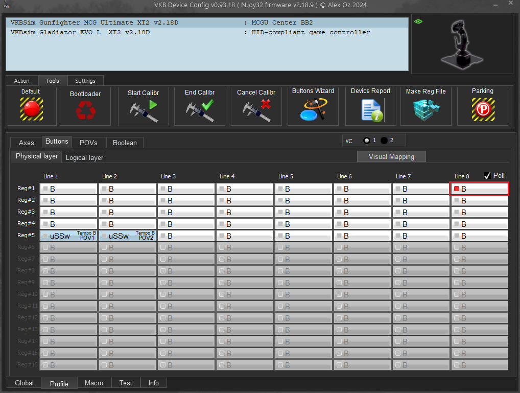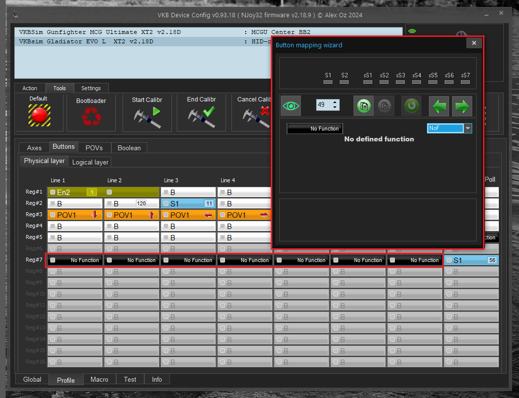 • Again on VKBDevCfg, and go to Profile / Buttons / Physical layer tab on EVO SCG L.