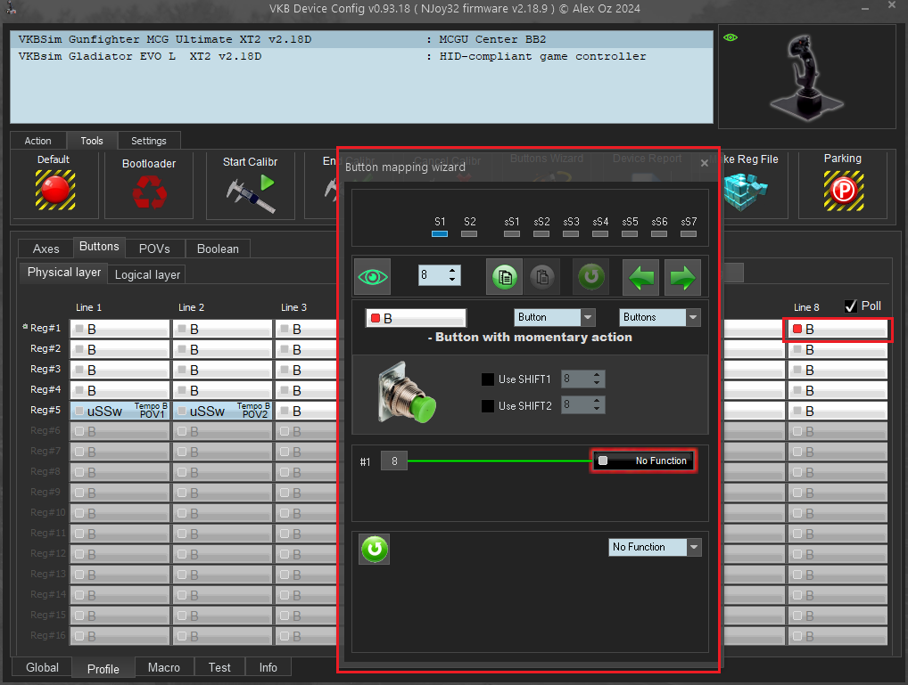 • Go back to VKBDevCfg, and go to Profile / Buttons / Physical layer tab on EVO SCG L.