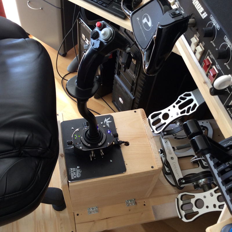 This was an Obutto Ozone, that I customized once I got different pedals to accommodate them, as they wouldn't fit the narrow monitor stand / pedal plate. The monitor stand / pedal plate is no more, and the monitor is now wall-mounted instead.