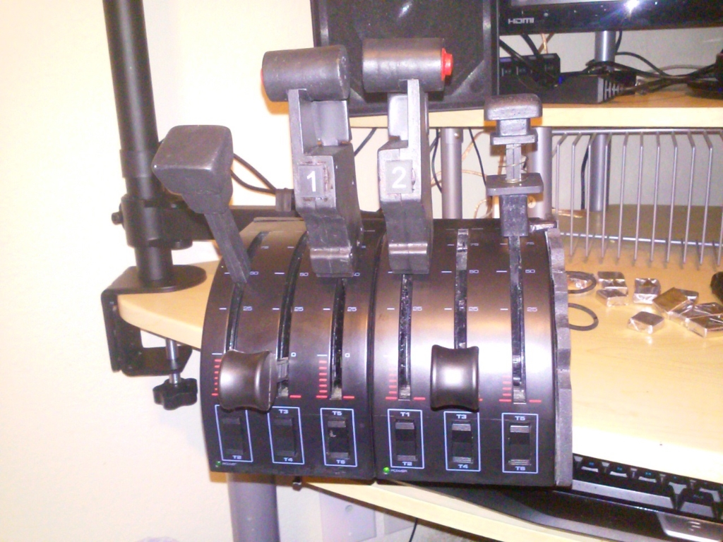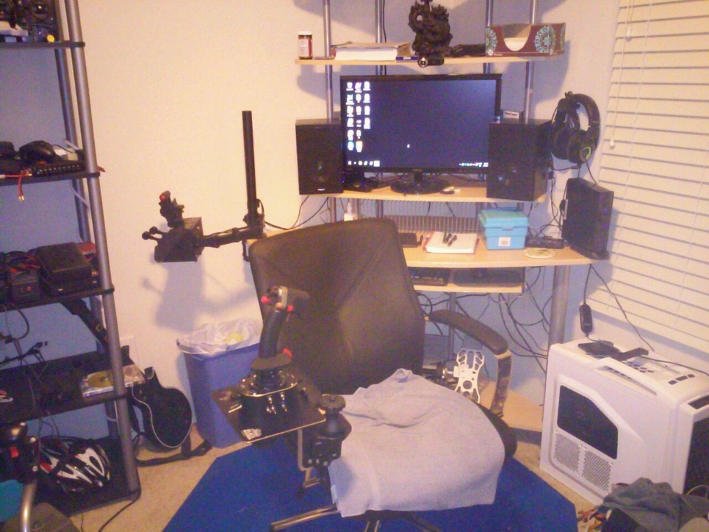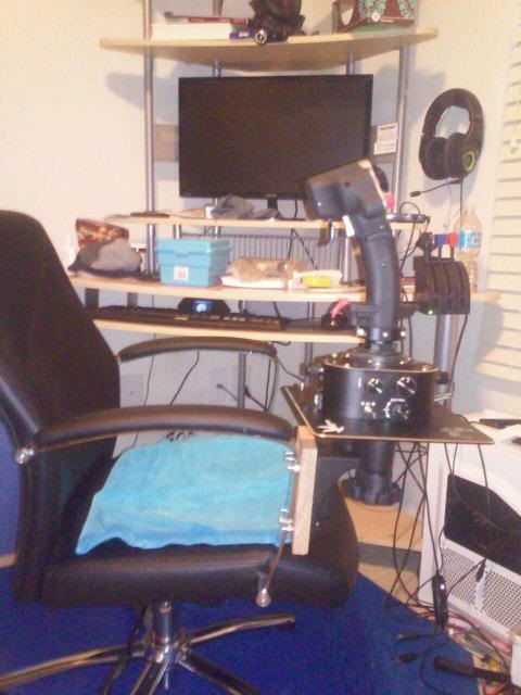 My flight stick is mounted to my arm chair on a swivel ram mount. This way I can just swivel it out of the way and pull my keyboard out and go with keyboard and mouse configuration while in FPS mode. Very tight mount very fast swivel. Share the pictures and ideas if you like with the others. I might also do this with the throttle quadrant I am working on as well.