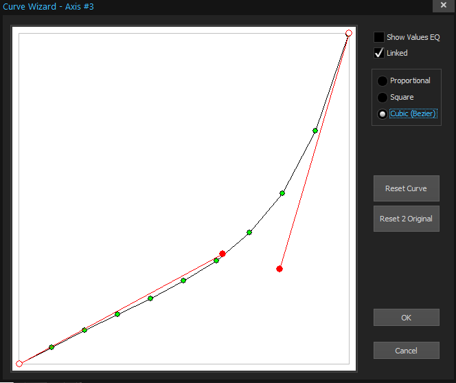 I apologize in advance for resurrecting this older thread, but it is very specific to my question on my Gunfighter Mk.III MCE Ultimate. For the X & Y axis, I setup multiple custom curves each with their own button. The values lines in the Response Curve section (lines 1 and 2) hold the data for the first custom curve when I setup the curve button for the X & Y axis. When I setup the second custom curve, with its own curve button, I have to reuse those two same Response Curve value lines (1 and 2) for the X & Y axis. As such, while the button for both custom curves work (X & Y axis), they both have the same curve. That is, they both use the values currently in lines 1 and 2 of the Response Curve section. I don't see how to have two separate custom curves for the X & Y axis when there appears to be only one storage location for the curve data. Thanks for helping me understand this capability as the software is still new to me.