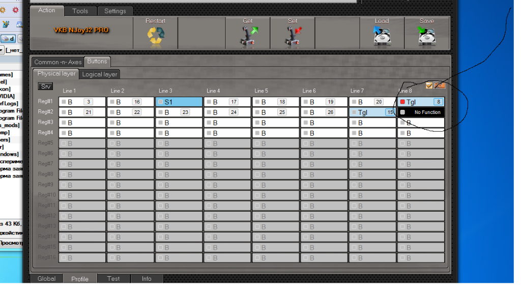 Скачал тут распиновку разъема бус и думаю дай подключу по быстрому к нему ручку. Для начала дай думаю проверю правильно ли указана распиновка, для этого мультиметром сел на VCC и землю (4 и 8 на рисунке), а он показывает 0.0 В. (разъем бус активировал). Сел на разъеме stick, а там 3.3 В. Значит думаю надо Вам опять написать про разъем бус. Решил взять еще раз ручку подключить к разъему stick проверить в проге при галочке на poll. Понажимал все кнопки и увидел, что тумлер (по умолчанию в джойстике был забит шифт) горит. Может разъем жив, но резистор я подключал и не горели кнопки.
