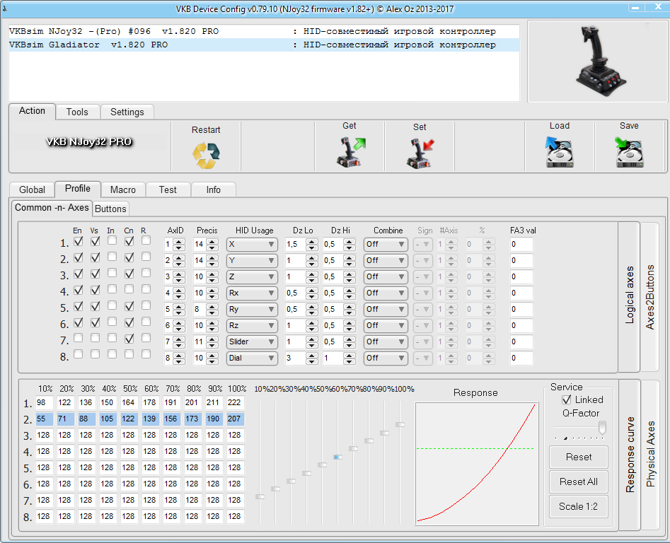 Какой программой можно кривые отклика (не мертвые зоны) осей в Гладиатор Про мк2 изменять.