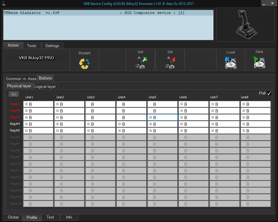 При тестировании во вкладке "Test" центральная кнопка левого министика (чашечки) MCG и кнопка В2 на основании Gladiator Pro задвоены.