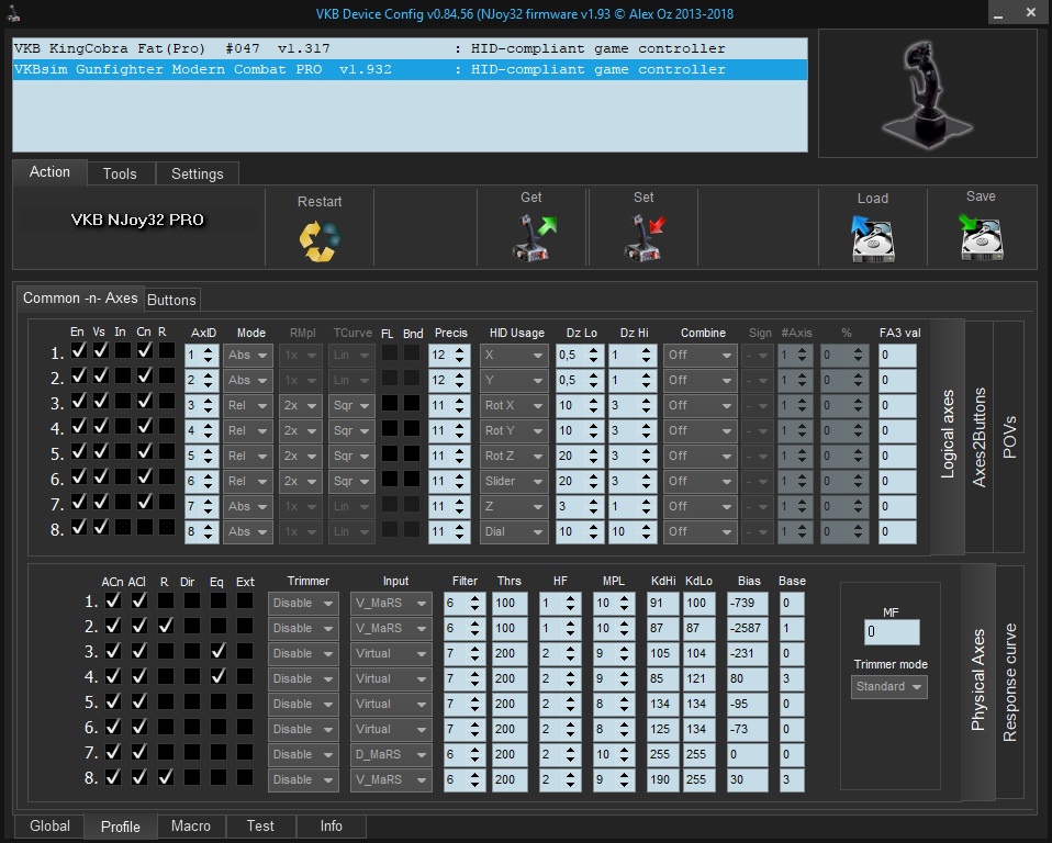 Оси GunFighter - работаю нормально. А кнопки - застревают в каком-то состоянии (верхний скрин). Лечится - перезагрузкой Ганфайтера (нижний скрин).