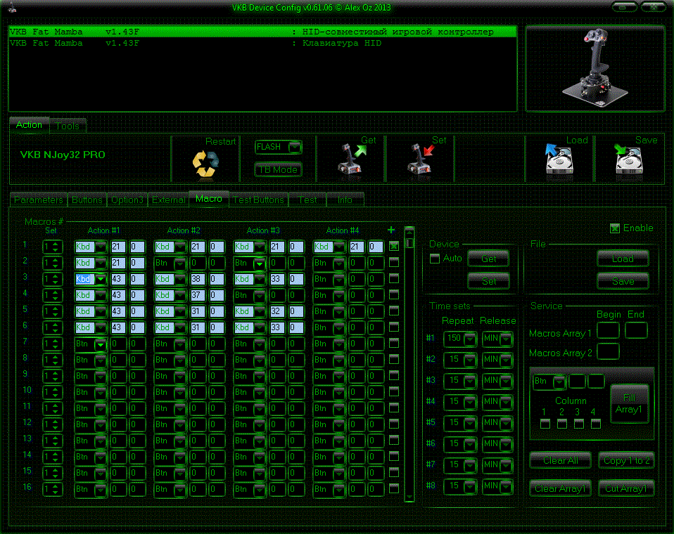 foxtrot верно говорит. Документация по контроллеру очень устарела и сложные вопросы (типа макросов) мало кому из разработчиков интересны. Думаю что нужно разбираться самим. Думаю что назрела идея создать некий ресурс накапливающий опыт эксплуатации устройств ВКБ под контроль комьюнити. Разработчикам и так огромная благодарность за девайсы, пусть не отвлекаются и занимаються ими и дальше, а удобства мы можем сделать и сами. Как вам идея если я запилю википедию по устройствам и контроллерам VKB? Для меня это будет способ лучше разобраться с девайсами, может быть это будет полезно и другим.