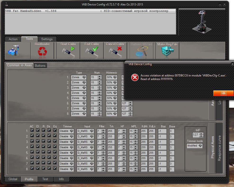 Ога, с новым. Ради прикола попробовал со старым - всё работает (ну кроме оси X ес-но). Отправил файлик Алексу, но он давно не заходил сюда, как и на форум IL2, надеюсь UIV посмотрит тему и ему передаст... ну или скажет в чём ещё может быть проблема.
