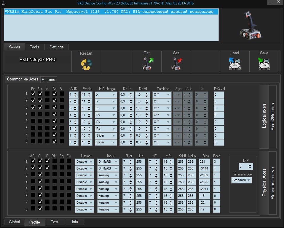 Да с новым конфигуратором джостик проснулся, джамперы переставил, чтобы уж наверняка активировал все оси в позиции D_МаРС но после нажатия кнопки SET он отдупляется опять, при этом новая вариация не видит больше джостика