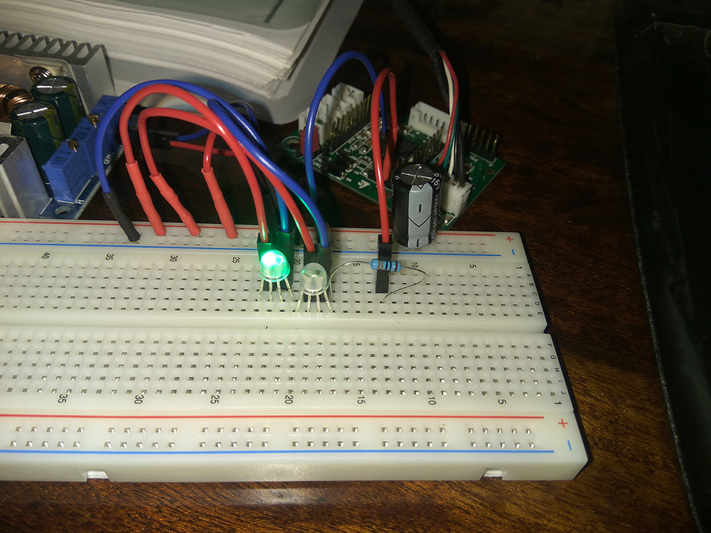 После неудачи с подключение светодиодной ленты WS2812b решил попробовать подключить светодиоды WS2812d-F5. Итак для согласования уровней по питанию купил DC-DC конвертер, согласно даташит светодиода WS2812d-F5 собрал на макетной плате схему подключения к контроллеру. Питание основное от блока питания через конвертер установил 3,8 V , между GND и +5V блока питания установил конденсатор 1000 мкФ. Межу MOSI и Din установил резистор сначала 75 Ом, когда первый светодиод не реагировал на установки в меню конфигуратора попробовал установить резистор 330 Ом - не помогло. Пробовал менять напряжение до 3,7 вольт,вообще убирать сопротивление между MOSI и Din результат во всех случаях одинаковый, первый светодиод не светится, второй светодиод опознается как 8 в меню кофигуратора. Реагирует на тест, на изменение цвета (единственны момент, что цвет который выставлен в конфигураторе не соответствует фактическому свечению светодиода). Как заставить контроллер работать первый светодиод ума не приложу. Да еще не пробовал повторно подключать через конвертер DC-DC светодиодную ленту WS2812b.