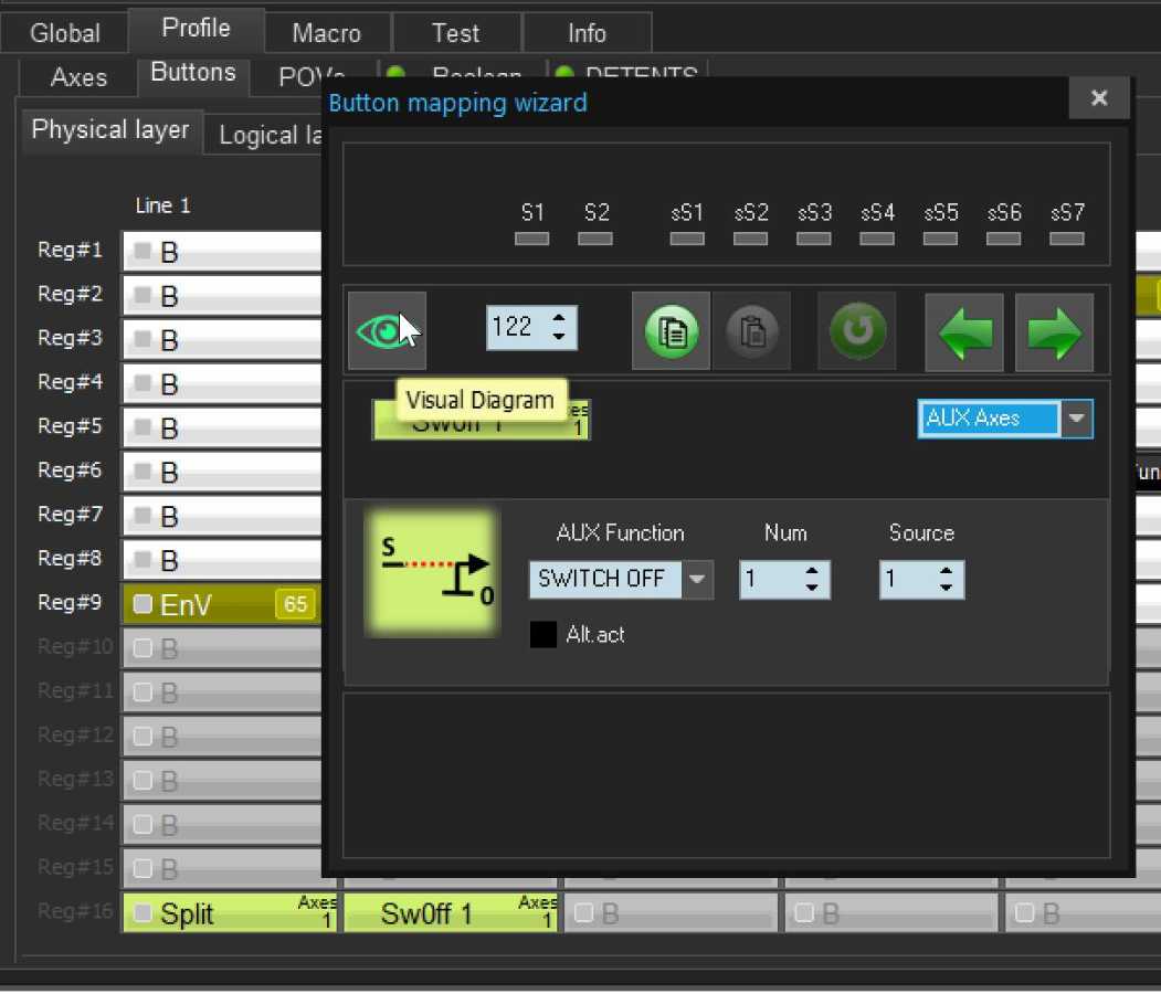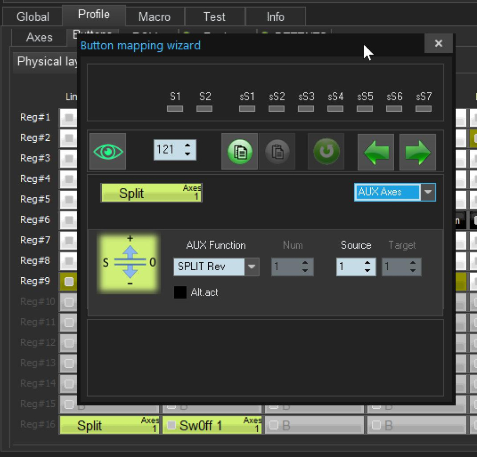 По управлению триггера функция Split будет реверсировать ось, SwitchOff - вспомогательная, блокирует ось в центре при заходе ручки в поле детента.