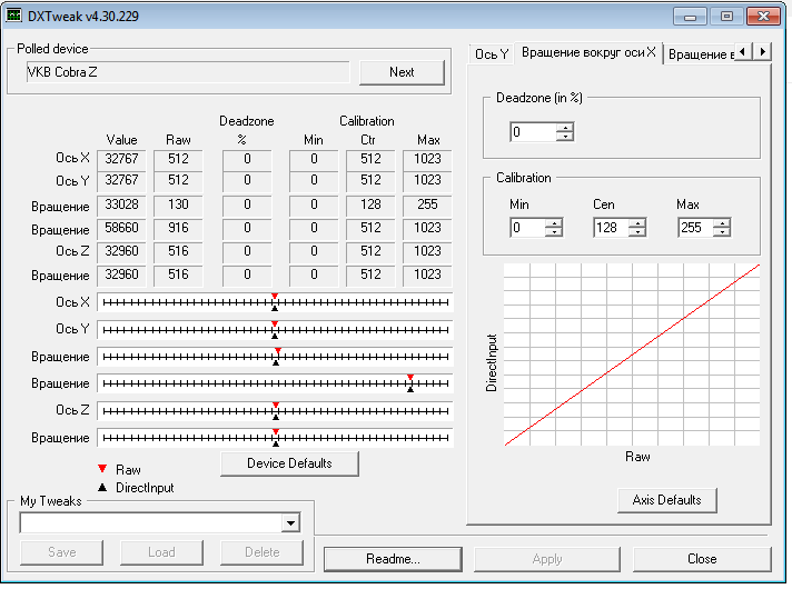 Жаль не сделал скрин программы dxtweak2 до исправления ошибки. Но точно помню, что на оси педалей (это четвертая ось вращения сверху) ползунок красного цвета "RAW" находился посередине , а вот черного "DirectInput" находился в крайней правой части линейки, и при перемещении оси в право оставался не подвижным, а при перемещении влево как бы догонял красный и совмещались они только в конце диапазона.