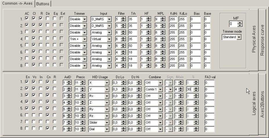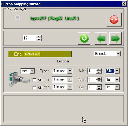 Click line 17. By default encoder is set as Discrete ()Type field). Choose Trimmer - to set as virtual axis! Choose Axis = 4. This is free axis number. ## 3 and 5 occupied by analog axes. Choose 64x (this parameter specifies axis sensivity). Leave Adv value.