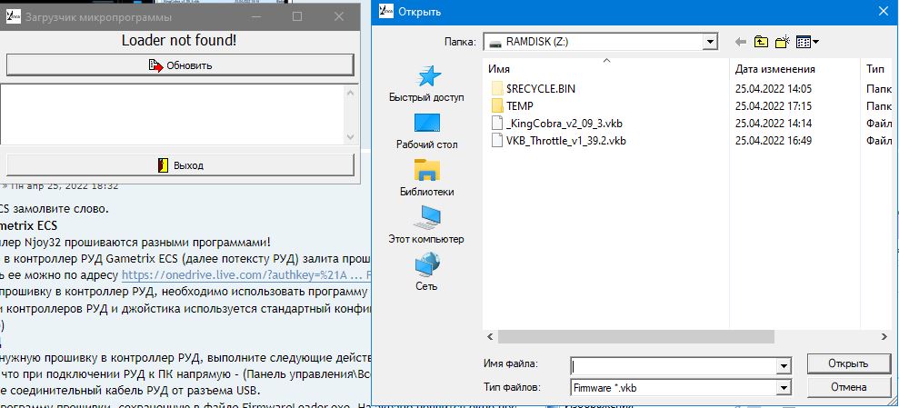 По умолчанию в контроллер РУД Gametrix ECS (далее потексту РУД) залита прошивка версии 1.11. Чтобы подключить РУД в качестве внешнего устройства к джойстику Кобра Z, необходимо залить прошивку версии 1.38 или новее. Скачать ее можно по адресу download/file.php?id=3171 (Название выглядит как VKB_Throttle_v1_38.zip)