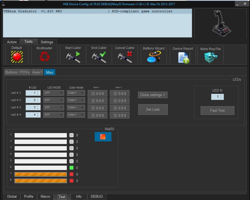 I made the cable as you specified swapping to cable connection to move Pin 3 from the Pedals to Pin 1 of the Gladiator Pro (and vice versa). This worked! My pedals are now showing up in VKB Device Config on Axis 6. Changing my profile so that the Rx axis was on AXID 6 got my pedals back working on Rot X. Thanks ALOT for your help!!!!! There is still the mystery of why Axis 7 appears to be dead on my Glad Pro but I am at least back in action for now! Here are the screenshots. If anyone else wants to try this the order of wires with the RJ45 connector oriented with the latch DOWN is as follows from Left to Right(note you only change one end of a standard Ethernet cable):