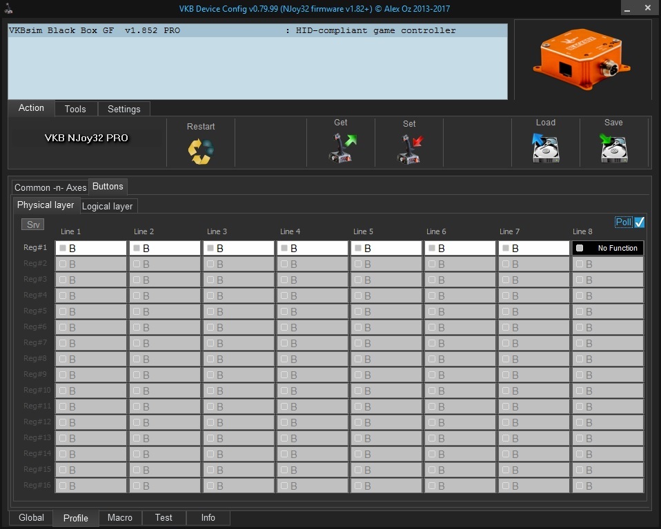 ChinNoobonic wrote:On the buttons page in the VKB config tool, with "Poll" ticked, do any of the slots light up when a button is pressed?