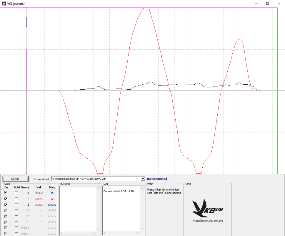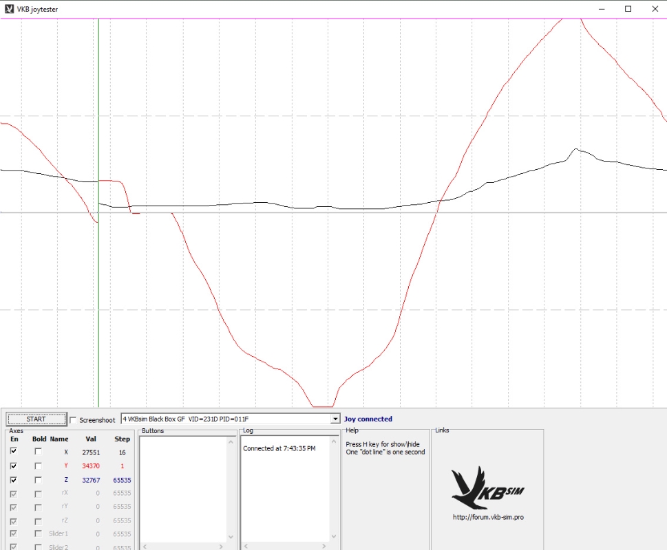 I have noticed that there is a strange 'step/spike' in my y-axis. It isn't a physical step, in that the spring tension increases in a linear fashion through the y-axis rotation. However when pulling the stick towards me there is a spike in the graph. I have tried running the VKB Device Config tool to calibrate the stick multiple times, but I can't get rid of this step. It is noticeable enough that it is affecting control of the aircraft, which is how I discovered it to begin with.