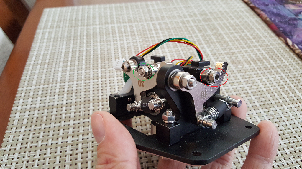 In the GREEN circle you can see the Y-Axis spring and cam which I have successfully changed out from the 10 cam and 20 spring to the 30 cam and the 30 spring. Note how there is a nut that is holding the bearing in place. Now, in the RED circle, note the X-Axis bearing. Note how this is NOT a normal bolt. It has a spot to be adjusted with an allen wrench, but the two allen wrenches provided by VKB with the Gunfighter do NOT fit this bolt. Like most people I have assembled a large amount of IKEA furniture over my lifetime so I have a pretty good supply of allen wrenches. A 1/8 allen wrench is too big for this nut, and a 3/32 is too small! I don't have a wrench to fit this bolt.