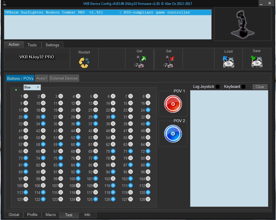 Issue is back after flashing to 1.921. It is like the first picture (bottom row of buttons reporting being pressed). Made sure I clicked set at the same time as before, but then tried not clicking set after default as well. If I click restart from VKB Device Config, the lights go off for a little while, but come back on after some short time (< 10 minutes). I'll live with this for a while and see if any games have problems. Those aren't even buttons I can use anyways.