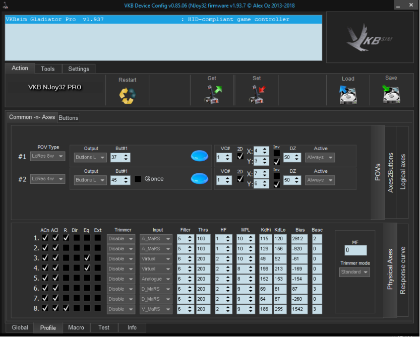 Save your current profile. Go to Butt0ns - logical layer tab. Press Srv button. Press Clear all button and OK in Physical layer dialog. We try to enable all buttons (No function disable) and reset logical button mapping (their numbers will correspond to physical ones). Set new settings and test stick.