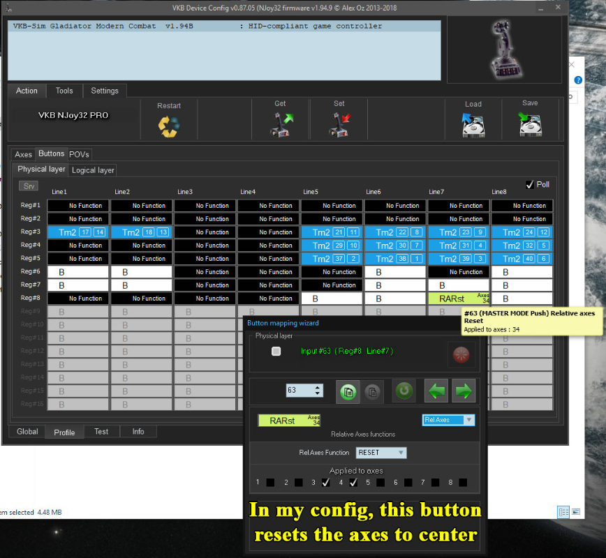 In my config, I removed the POV on/off toggle (Master Mode) because in most cases it is a useless feature (unless your game cannot rebind the POV functions... ie the POV acts as a view slew no matter what and you cannot change it). Switching POV on/off doesn't disable the axes, so if you were using the axes of the hat to control one thing (let's say elevator trim), and the POV (with the same hat) to control something else(let's say gunpod up/down), even if you "turn on" the POV mode you are still moving the axes (both gunpod would move AND elevator trim would change). So for that reason, I reassigned the top thumbstick's button to "reset" it's relative axes back to center. So to recap: A) the left stick (Gate) are absolute axes with an 8-way POV and pressing it is seen as a normal button. B) the top stick (Master) are relative axes and a 4-way switch/button and pressing it resets the relative axes to center.