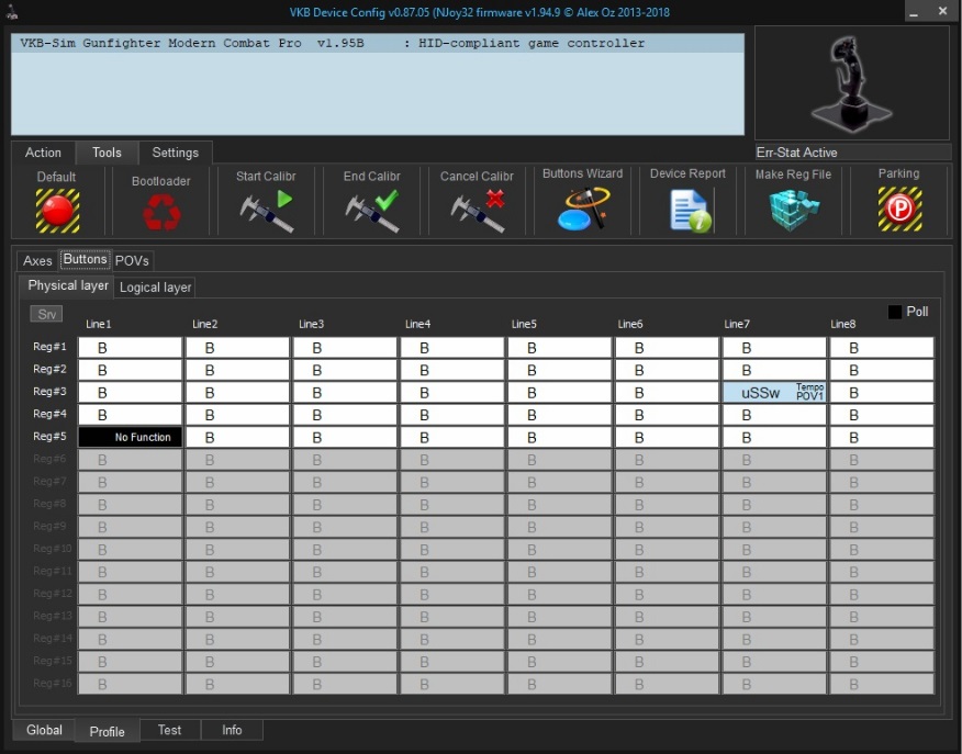 RecklessPrudence wrote:A much easier way of doing this is to use the 'AxesToButton' functionality. Go to axis 8, set it to Edges1, Zone 1, set it to a percentage point that you're comfortable with (ie 25% will press the button when you've pulled the brake lever three-quarters of the way, 0% will press the button only when the lever is pulled completely to the end of its travel), and set it to an unused button. Remember to click the checkbox in the top left to enable the AxesToButton content you customised. Et voila! You have a button! If you are really set on not using the analogue axis of the brake, you can go to the Logical Axes tab and hide the axis. Don't disable it, that will stop your button from working - just hide it from the HID. Tada! You now have a button that activates when you pull the brake, and no analogue axis to confuse your game.